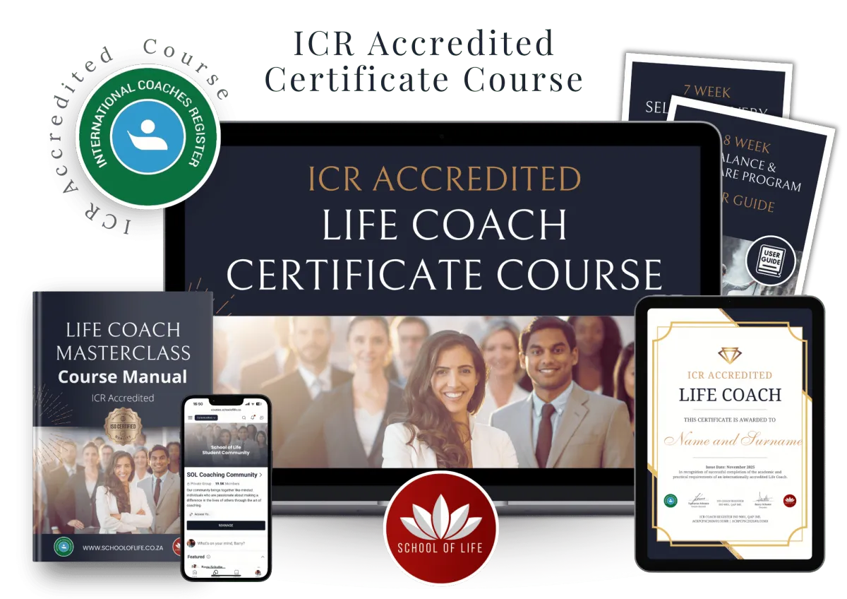 School of Life is an ICR (International Coach Register) accredited & approved coach training agency. On successful completion of this online life coach certification course, you will receive your internationally recognized life coach certificate, allowing you to coach anywhere in the world.